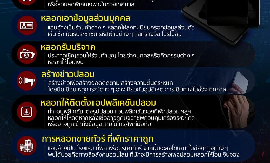 สำนักงานตำรวจแห่งชาติ จึงขอเอาโอกาสนี้มาเตือนพี่น้องประชาชนให้ระมัดระวังตนเอง เพื่อไม่ให้ตกเป็นเหยื่อของกลุ่มมิจฉาชีพ เพราะอย่าลืมว่า แม้จะเป็นวันหยุด แต่มิจฉาชีพไม่เคยหยุด ซึ่งรูปแบบของภัยออนไลน์ที่พี่น้องประชาชนต้องระมัดระวังเป็นพิเศษ ในช่วงส่งท้ายปีเก่าต้อนรับปีใหม่ มีดังนี้